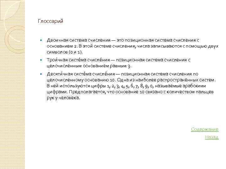 Глоссарий Двоичная система счисления — это позиционная система счисления с основанием 2. В этой системе счисления, числа записываются с помощью двух символов (0 и 1). Трои чная систе ма счисле ния — позиционная система счисления с целочисленным основанием равным 3. Десяти чная систе ма счисле ния — позиционная система счисления по целочисленному основанию 10. Одна из наиболее распространённых систем. В ней используются цифры 1, 2, 3, 4, 5, 6, 7, 8, 9, 0, называемые арабскими цифрами. Предполагается, что основание 10 связано с количеством пальцев рук у человека. Содержание Назад