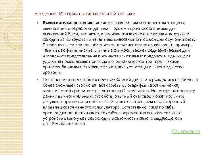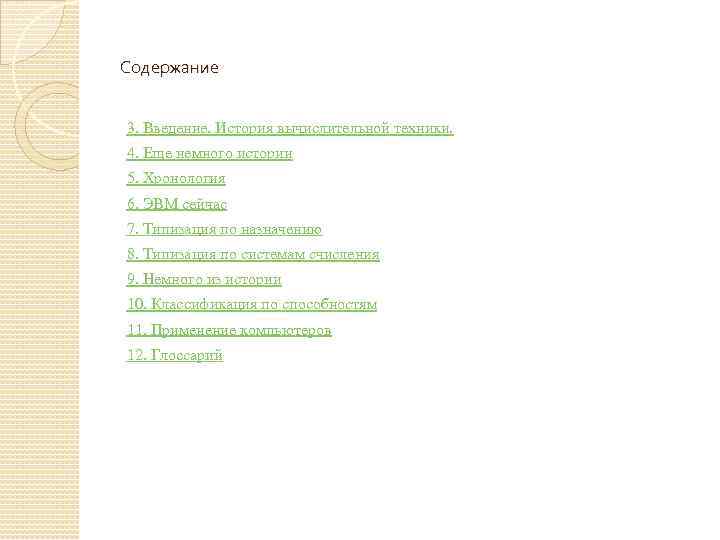 Содержание 3. Введение. История вычислительной техники. 4. Еще немного истории 5. Хронология 6. ЭВМ сейчас 7. Типизация по назначению 8. Типизация по системам счисления 9. Немного из истории 10. Классификация по способностям 11. Применение компьютеров 12. Глоссарий