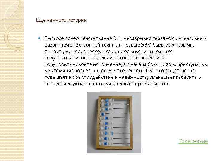 Еще немного истории Быстрое совершенствование В. т. неразрывно связано с интенсивным развитием электронной техники: первые ЭВМ были ламповыми, однако уже через несколько лет достижения в технике полупроводников позволили полностью перейти на полупроводниковое исполнение, а с начала 60 -х гг. 20 в. приступить к микроминиатюризации схем и элементов ЭВМ, что существенно повышает их быстродействие и надёжность, уменьшает габариты и потребляемую мощность, удешевляет производство. Содержание
