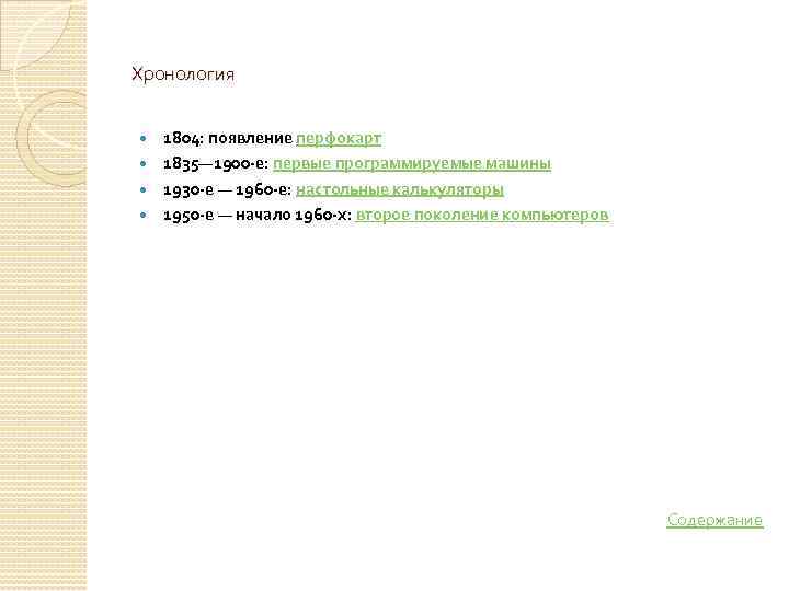 Хронология 1804: появление перфокарт 1835— 1900 -е: первые программируемые машины 1930 -е — 1960 -е: настольные калькуляторы 1950 -е — начало 1960 -х: второе поколение компьютеров Содержание