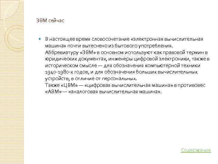 ЭВМ сейчас В настоящее время словосочетание «электронная вычислительная машина» почти вытеснено из бытового употребления. Аббревиатуру «ЭВМ» в основном используют как правовой термин в юридических документах, инженеры цифровой электроники, также в историческом смысле — для обозначения компьютерной техники 1940 -1980 -х годов, и для обозначения больших вычислительных устройств, в отличие от персональных. Также «ЦВМ» — «цифровая вычислительная машина» в противовес «АВМ» — «аналоговая вычислительная машина» . Содержание