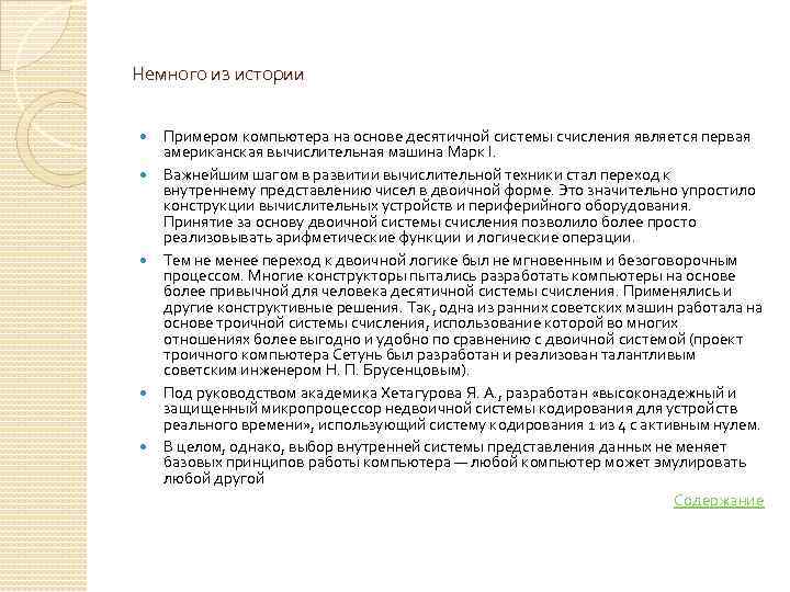 Немного из истории Примером компьютера на основе десятичной системы счисления является первая американская вычислительная машина Марк I. Важнейшим шагом в развитии вычислительной техники стал переход к внутреннему представлению чисел в двоичной форме. Это значительно упростило конструкции вычислительных устройств и периферийного оборудования. Принятие за основу двоичной системы счисления позволило более просто реализовывать арифметические функции и логические операции. Тем не менее переход к двоичной логике был не мгновенным и безоговорочным процессом. Многие конструкторы пытались разработать компьютеры на основе более привычной для человека десятичной системы счисления. Применялись и другие конструктивные решения. Так, одна из ранних советских машин работала на основе троичной системы счисления, использование которой во многих отношениях более выгодно и удобно по сравнению с двоичной системой (проект троичного компьютера Сетунь был разработан и реализован талантливым советским инженером Н. П. Брусенцовым). Под руководством академика Хетагурова Я. А. , разработан «высоконадежный и защищенный микропроцессор недвоичной системы кодирования для устройств реального времени» , использующий систему кодирования 1 из 4 с активным нулем. В целом, однако, выбор внутренней системы представления данных не меняет базовых принципов работы компьютера — любой компьютер может эмулировать любой другой Содержание