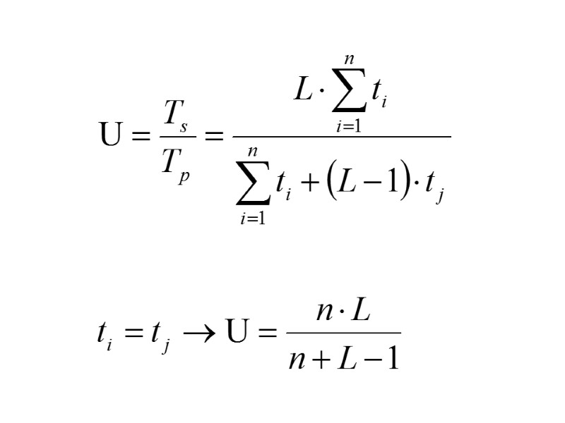 Для того, чтобы оценить, какое ускорение U может быть получено на компьютере из N процессоров при заданном значении S, можно воспользоваться законом Амдала: Если 9/10 программы исполняется параллельно, а 1/10 по-прежнему последовательно, то ускорения более, чем в 10 раз получить в принципе невозможно.