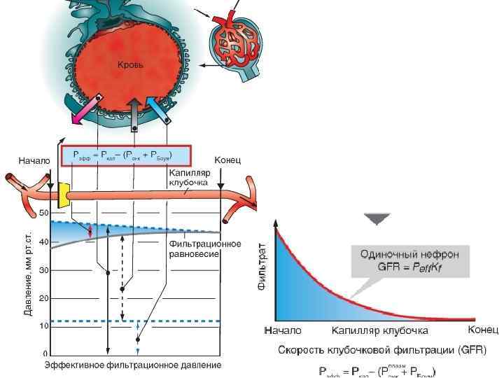 Факторы влияющие на величину фильтрации 1) Силы Старлинга • • ∆Ргидр в клубочках и капсуле Боумена ∆Ронк плазмы и фильтрата 2) проницаемость барьера 3) поверхность фильтрации≈ 1. 7 м 2 (роль мезангиальных клеток) 4) отр. заряд фильтруемых растворов 5) почечный кровоток