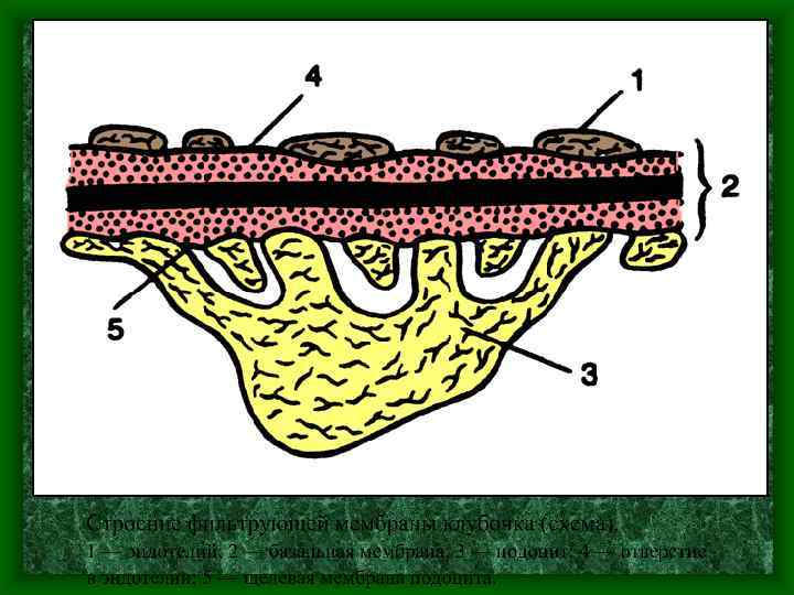 Клубочковый фильтр • 1. Эндотелиальные клетки капилляров (поры диаметром 50 -100 нм). • 2. Базальная мембрана (3 -х слойная) (поры 3 -7, 5 нм; анионные локусы). • 3. Подоциты (щели между отростками подоцитов перекрыты щелевидной мембраной с порами 4 -14 нм; отрицательный заряд).
