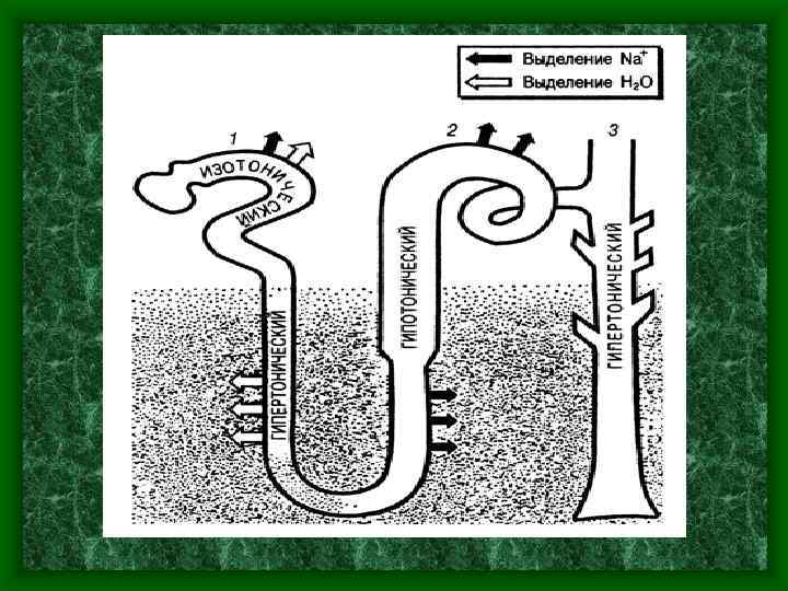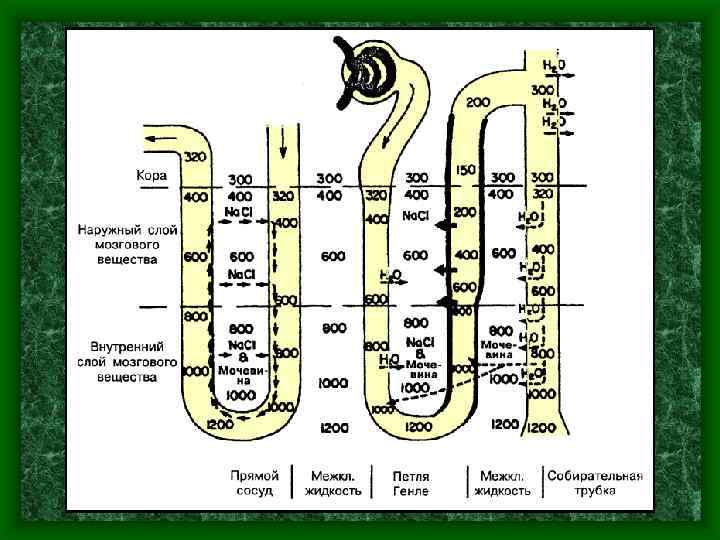 • Во всасывании воды и электролитов, а также в механизме концентрирования мочи большое значение имеет • поворотно-противоточномножительная система