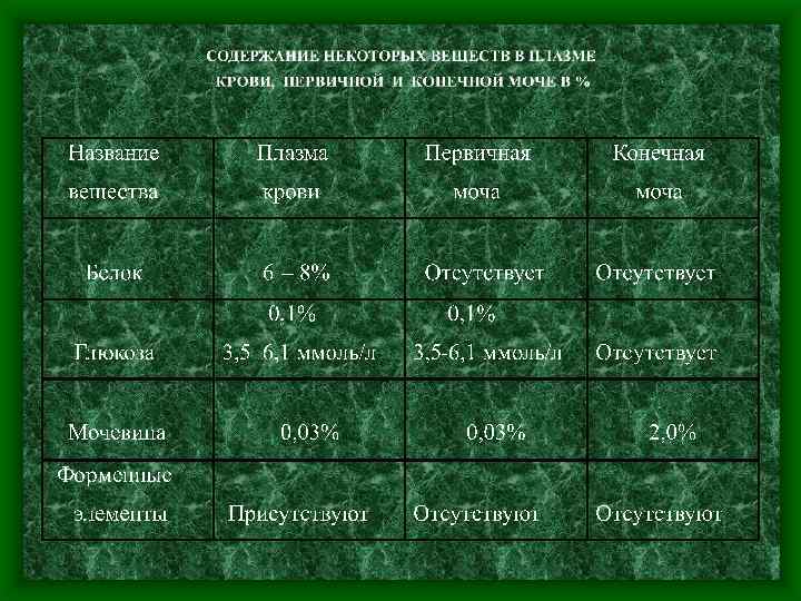 Первичная моча не должна содержать форменных элементов крови и большей части белков (немного фильтруются альбумины), в остальном она близка к плазме крови
