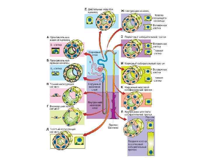 Мембранные механизмы транспорта Na+ в клетках различных отделов нефрона В базальных мембранах всех типов клеток содержится Na, К-АТФаза, обеспечивающая обмен ионов Na+ на ионы К+. В люминальной мембране локализована система котранспорта Na+ и глюкозы (G), натриевые каналы, система котранспорта некоторых других ионов; стрелками указаны участки нефрона, где находятся клетки соответствующих типов.
