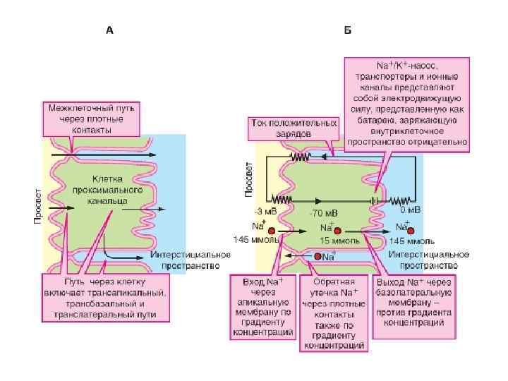 Проксимальные канальца • Практически полностью реабсорбируются аминокислоты, глюкоза, витамины, белки, микроэлементы. В этом же отделе реабсорбируется около 2/3 воды и неорганических ионов: Na+, K+, Ca 2+, Mg 2+, Cl-, HCO 3 -. • Здесь реабсорбируются те вещества, которые необходимы организму для обеспечения его жизнедеятельности, как бы по ошибке попавшие в мочу. Механизм реабсорбции подавляющего большинства указанных выше соединений прямо или косвенно взаимосвязан с реабсорбцией Nа+.