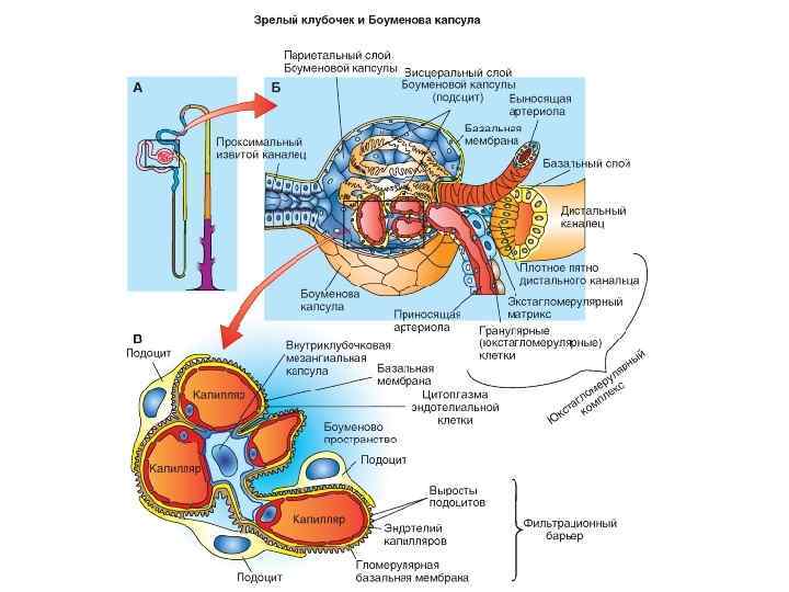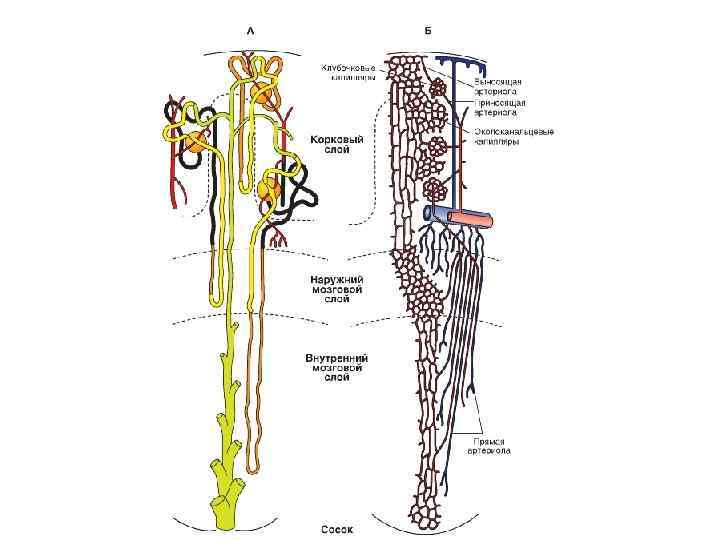 Нефрон • • • А — юкстамедуллярный нефрон; Б — суперфициальный нефрон. I — корковое вещество, II — наружная зона мозгового вещества. III — внутренняя зона мозгового вещества; 1 — клубочек, 2 —проксимальный извитой каналец 3 — проксимальный прямой каналец 4 — тонкий каналец (тонкая нисходящая ветвь петли Генле), 5 — тонкий каналец (тонкая восходящая ветвь петли Генле), 6 — дистальный каналец (толстая восходящая ветвь петли Генле), 7 — плотное пятно, 8 — дистальный извитой каналец, 9 — связующий каналец (в юкстамедуллярном нефроне образует аркаду), 10 — начальные отделы собирательной трубки, 11 — собирательные трубки наружного мозгового вещества, 12 — собирательные трубки внутреннего мозгового вещества.