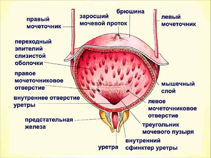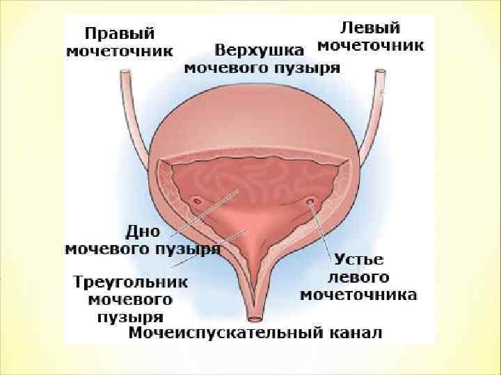 Мочевой пузырь Мешок, стенки которого состоят из гладкой мускулатуры, выстланной переходным эпителием. У мочевого пузыря выделяют верхушку, тело мочевого пузыря, дно мочевого пузыря. В области дна к нему под острым углом подходят мочеточники
