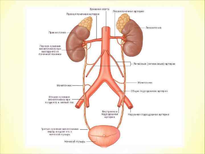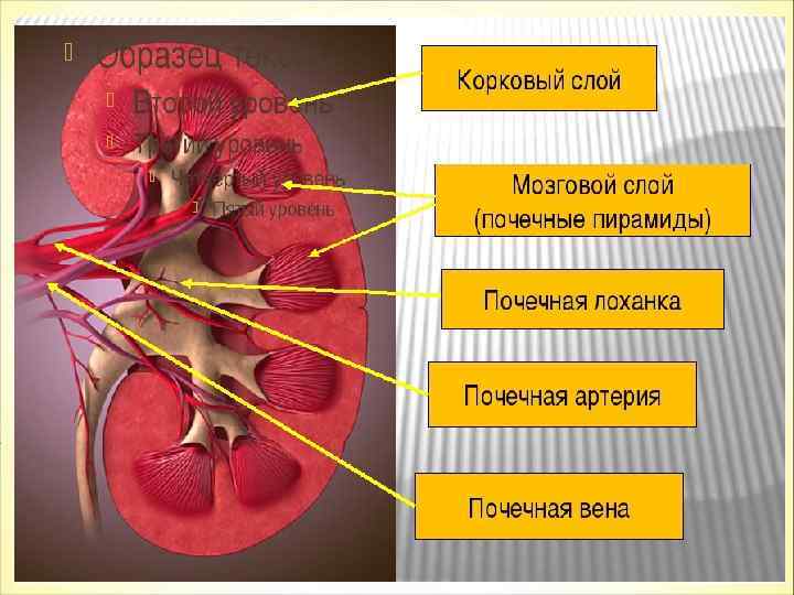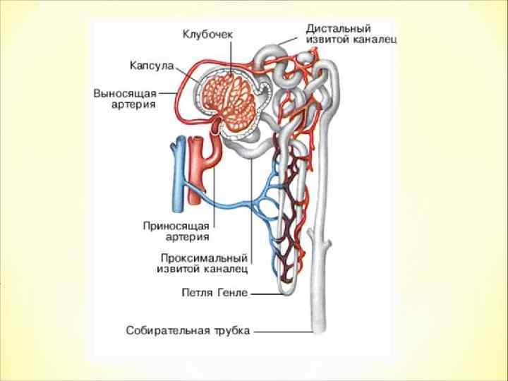 Кора почек – темный наружный слой, в который погружены микроскопические почечные тельца – нефроны. Мозговое вещество – представленно многочисленными извитыми канальцами, идущими от капсул нефронов и возвращающимися в кору почек. Почечная лоханка – имеет форму воронки, широкой стороной обращена к пирамидкам, узкой – к воротам почки Ворота почки – вогнутая сторона почки, от которой отходит мочеточник