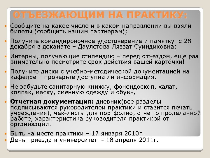 ОТЪЕЗЖАЮЩИМ НА ПРАКТИКУ: Сообщите на какое число и в каком направлении вы взяли билеты (сообщить нашим партнерам); Получите командировочное удостоверение и памятку с 28 декабря в деканате – Даулетова Ляззат Суиндиковна; Интерны, получающие стипендию – перед отъездом, еще раз внимательно посмотрите срок действия вашей карточки! Получите диски с учебно-методической документацией на кафедре – проверьте доступна ли информация. Не забудьте санитарную книжку, фонендоскоп, халат, колпак, маску, сменную одежду и обувь, Отчетная документация: дневник(все разделы подписываются руководителем практики и ставится печать учреждения), чек-листы для портфолио, отчет о проделанной работе, характеристика руководителя практикой от организации. Быть на месте практики – 17 января 2010 г. День приезда в университет - 18 апреля 2011 г.