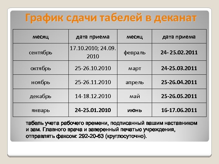 График сдачи табелей в деканат месяц дата приема сентябрь 17. 10. 2010; 24. 09. 2010 февраль 24 - 25. 02. 2011 октябрь 25 -26. 10. 2010 март 24 -25. 03. 2011 ноябрь 25 -26. 11. 2010 апрель 25 -26. 04. 2011 декабрь 14 -18. 12. 2010 май 25 -26. 05. 2011 январь 24 -25. 01. 2010 июнь 16 -17. 06. 2011 табель учета рабочего времени, подписанный вашим наставником и зам. Главного врача и заверенный печатью учреждения, отправлять факсом: 292 -20 -63 (круглосуточно).