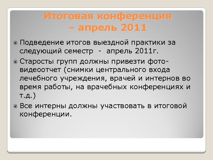 Итоговая конференция – апрель 2011 Подведение итогов выездной практики за следующий семестр - апрель 2011 г. Старосты групп должны привезти фотовидеоотчет (снимки центрального входа лечебного учреждения, врачей и интернов во время работы, на врачебных конференциях и т. д. ) Все интерны должны участвовать в итоговой конференции.