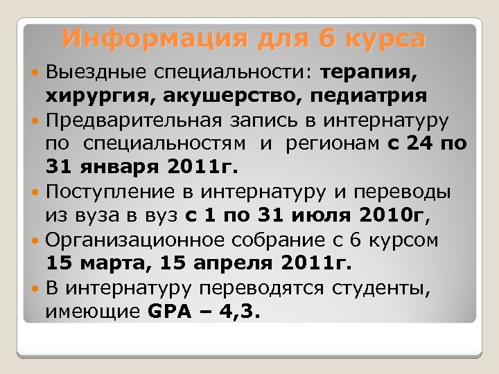 Информация для 6 курса Выездные специальности: терапия, хирургия, акушерство, педиатрия Предварительная запись в интернатуру по специальностям и регионам с 24 по 31 января 2011 г. Поступление в интернатуру и переводы из вуза в вуз с 1 по 31 июля 2010 г, Организационное собрание с 6 курсом 15 марта, 15 апреля 2011 г. В интернатуру переводятся студенты, имеющие GPA – 4, 3.