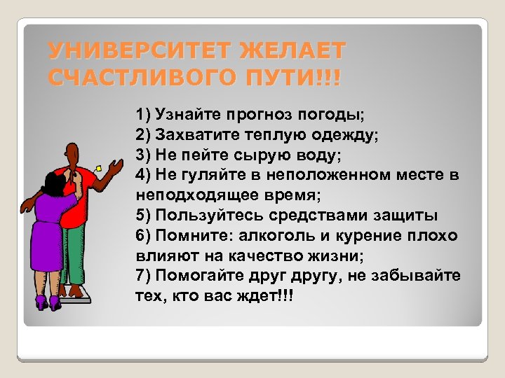 УНИВЕРСИТЕТ ЖЕЛАЕТ СЧАСТЛИВОГО ПУТИ!!! 1) Узнайте прогноз погоды; 2) Захватите теплую одежду; 3) Не пейте сырую воду; 4) Не гуляйте в неположенном месте в неподходящее время; 5) Пользуйтесь средствами защиты 6) Помните: алкоголь и курение плохо влияют на качество жизни; 7) Помогайте другу, не забывайте тех, кто вас ждет!!!
