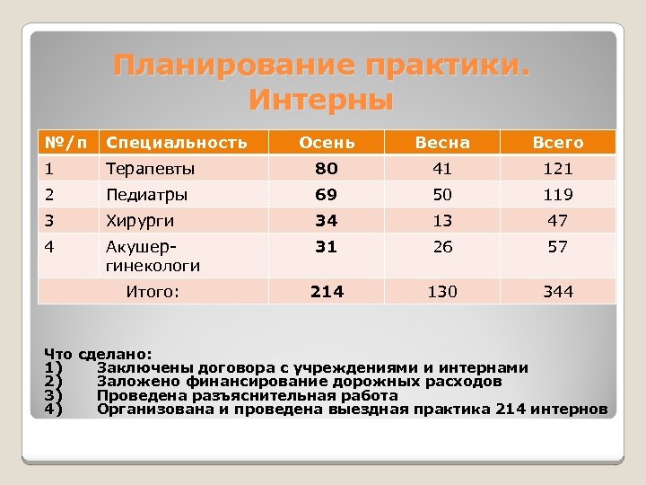 Планирование практики. Интерны №/п Специальность Осень Весна Всего 1 Терапевты 80 41 121 2 Педиатры 69 50 119 3 Хирурги 34 13 47 4 Акушергинекологи 31 26 57 Итого: 214 130 344 Что сделано: 1) Заключены договора с учреждениями и интернами 2) Заложено финансирование дорожных расходов 3) Проведена разъяснительная работа 4) Организована и проведена выездная практика 214 интернов