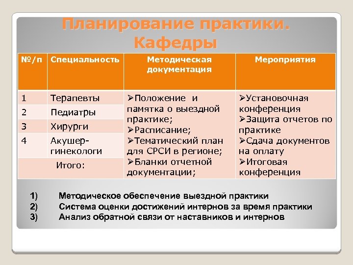 Планирование практики. Кафедры №/п Специальность 1 Терапевты 2 Педиатры 3 Хирурги 4 Акушергинекологи Итого: 1) 2) 3) Методическая документация ØПоложение и памятка о выездной практике; ØРасписание; ØТематический план для СРСИ в регионе; ØБланки отчетной документации; Мероприятия ØУстановочная конференция ØЗащита отчетов по практике ØСдача документов на оплату ØИтоговая конференция Методическое обеспечение выездной практики Система оценки достижений интернов за время практики Анализ обратной связи от наставников и интернов