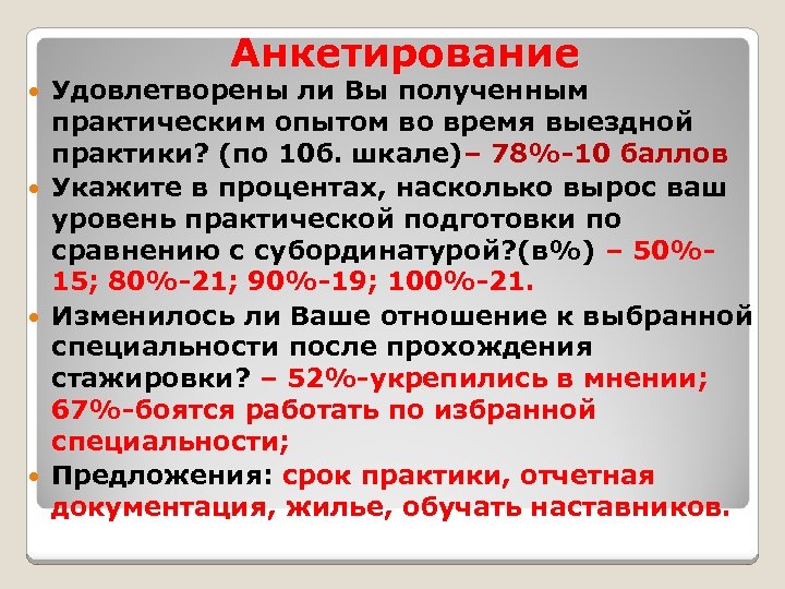 Анкетирование Удовлетворены ли Вы полученным практическим опытом во время выездной практики? (по 10 б. шкале)– 78%-10 баллов Укажите в процентах, насколько вырос ваш уровень практической подготовки по сравнению с субординатурой? (в%) – 50%15; 80%-21; 90%-19; 100%-21. Изменилось ли Ваше отношение к выбранной специальности после прохождения стажировки? – 52%-укрепились в мнении; 67%-боятся работать по избранной специальности; Предложения: срок практики, отчетная документация, жилье, обучать наставников.