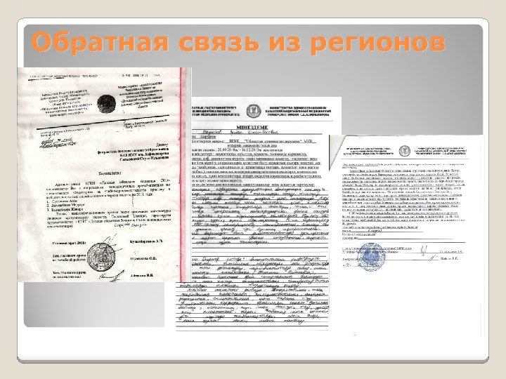 Планирование практики. Регионы №/п Место практики Базы Сотрудники 1 г. Уральск 3 3 2 г. Петропавловск 3 3 3 г. Кызылорда 3 3 4 г. Тараз 3 3 5 г. Талдыкорган 5 6 6 Алматинская область (Каскелен, Есик, Талгар, ГРЭС) 5 6 24 24 Итого: Что сделано: 1) Заключены договора с лечебными учреждениями 2) Оформление врачей из регионов совместителями 3) Табелирование наставников в регионах 4) Контроль и консультация наставников и интернов на местах