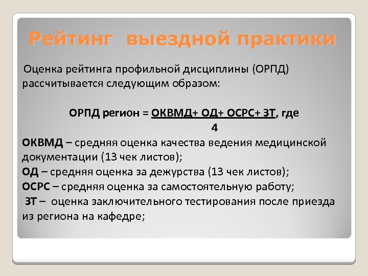 Рейтинг выездной практики Оценка рейтинга профильной дисциплины (ОРПД) рассчитывается следующим образом: ОРПД регион = ОКВМД+ ОСРС+ ЗТ, где 4 ОКВМД – средняя оценка качества ведения медицинской документации (13 чек листов); ОД – средняя оценка за дежурства (13 чек листов); ОСРС – средняя оценка за самостоятельную работу; ЗТ – оценка заключительного тестирования после приезда из региона на кафедре;