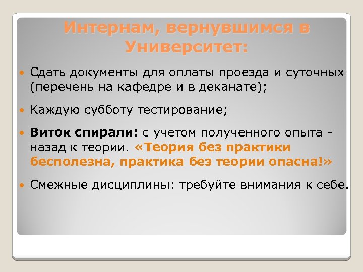 Интернам, вернувшимся в Университет: Сдать документы для оплаты проезда и суточных (перечень на кафедре и в деканате); Каждую субботу тестирование; Виток спирали: с учетом полученного опыта назад к теории. «Теория без практики бесполезна, практика без теории опасна!» Смежные дисциплины: требуйте внимания к себе.