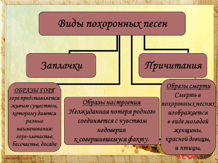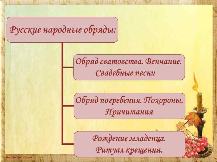 Народные обряды делятся на два цикла: • календарные обряды, связанные с хозяйственной деятельностью крестьянина (земледелие, животноводство, охота). Календарные обряды приурочены к зиме, весне, лету, осени – в связи с распорядком сельскохозяйственных работ по временам года, а также зимнему и летнему солнцевороту (21, 22 декабря и 21, 22 июня) • семейно-бытовые обряды, связанные с рождением человека, его вступлением в брак, проводами в армию или смертью. Свадебный обряд состоял из ряда последовательных действий, ни одно из которых не пропускалось. На похоронах профессиональными плакальщицами (вопленицами) исполнялись причитания: эти плачи сопровождали все эпизоды похоронного обряда.