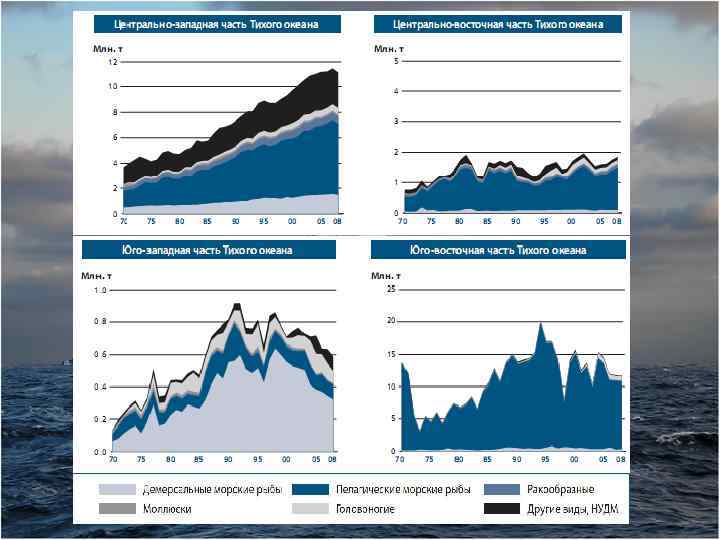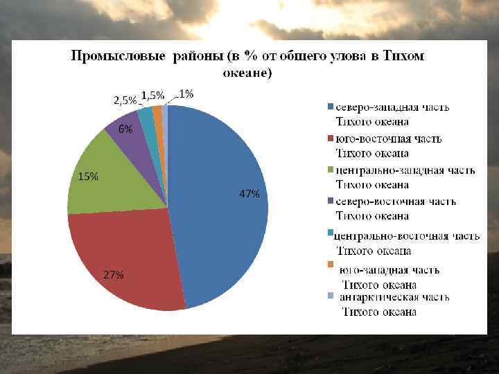 Краткий вывод: üДобыча нерыбных объектов во всех промысловых районах Тихого океана характеризуется относительной стабильностью и тенденциями к росту; üТихий океан — наиболее крупный поставщик рыбы и морепродуктов; современный üОграничения некоторых капиталистических стран в своих исключительных экономических зонах снижают возможности рационального использования биологических богатств районов Тихого океана, что отрицательно сказывается на хозяйственной деятельности в океане.
