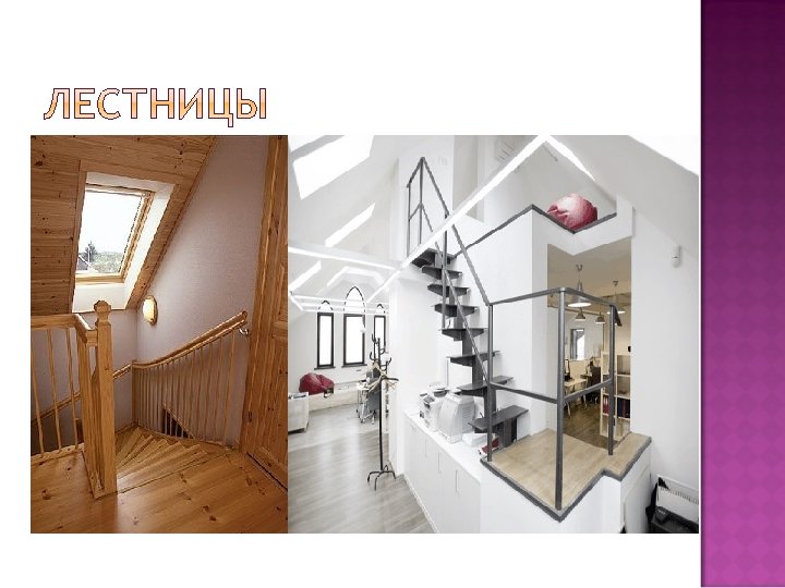 При разработке интерьера мансардного этажа следует учитывать некоторые характерные геометрические формы помещений. Речь идет о размещении лестниц, обстановке ванной комнаты и туалета, кухни, а также о размещении дверей. Следует принимать во внимание свободную высоту лестничных маршей в отношении наклонных поверхностей крыши. Не возникает трудностей, когда направление лестницы параллельно уклону крыши или лестница размещена по средней оси здания.
