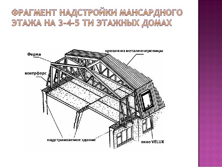 Конструктивная схема, материал ограждающих конструкций и деталей мансарды определяются с учетом единства конструкции и архитектурных форм зданияосновы (Применение легких конструкций, деталей и изделий является основным требованием). Мансарда с крутоуклонной крышей требует особого подхода к выбору кровельного материала, обеспечению теплозащиты, герметизации и гидроизоляции.