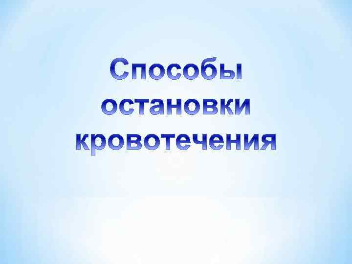 Этапы первой медицинской помощи при 1. Устранить действиекровотечении травмирующих факторов 2. Восстановление дыхания 3. Борьба с болью 4. Остановка кровотечения 5. Наложение стерильной повязки 7. Обеспечение наиболее удобного положения тела 9. Или вызов по тел. 03 ”Скорой помощи ” пострадавшему 6. Обездвиживание тела подручными средствами 8. Быстрая и бережная доставка пострадавшего в медицинское учреждение
