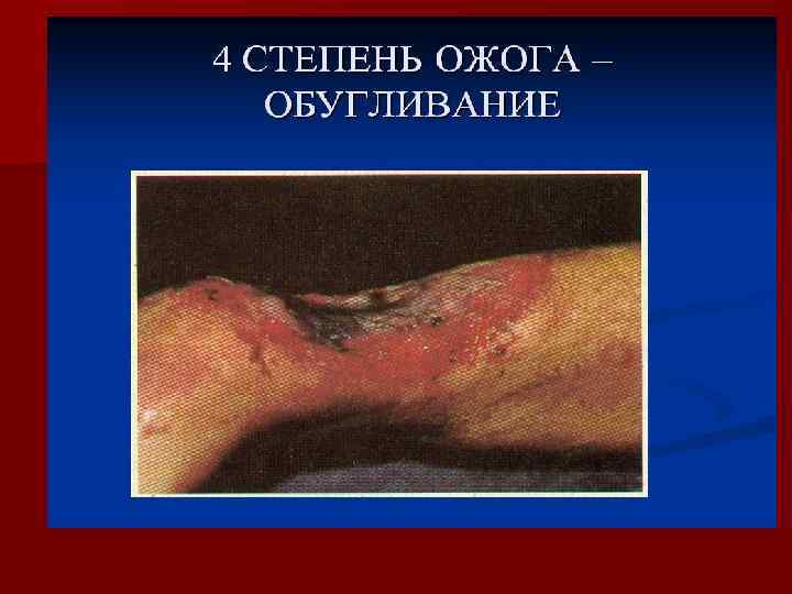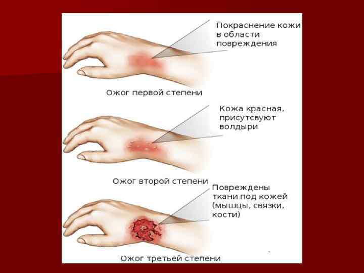 n IV степень – гибель не только всех слоев кожи, но и нижележащих тканей (мышц, сухожилий, костей). Помощь при ожогах III-IV степени осуществляется в стационарных условиях с применением хирургических операций по пересадке кожи.