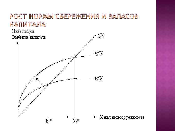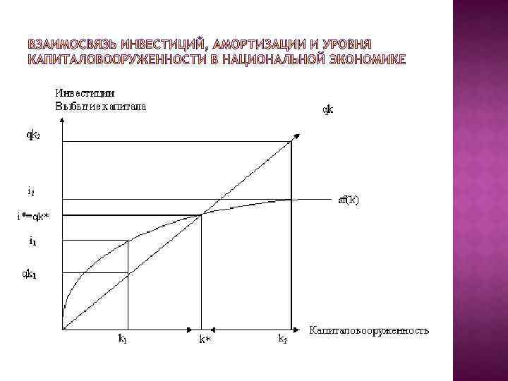 i=sy( инвестиции = норма сбережений* объем производства) Y=f(k)-объём производства i=sf(k)-инвестиции Qk-выбытие капитала Dk-изменение запасов При k* dk(изменение запасов)=0