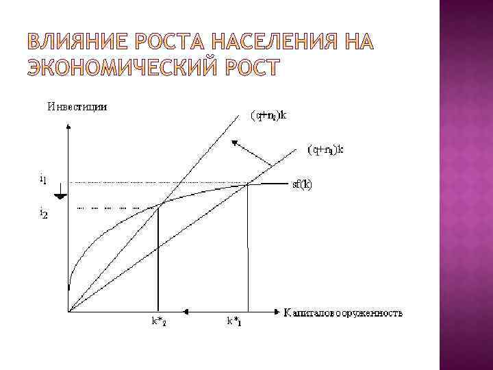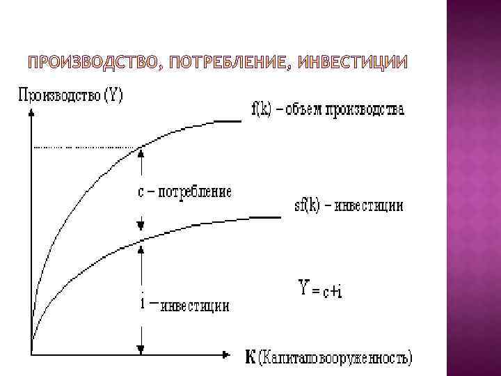 (q+n)k*- инвестиции устойчивого состояния Q- норма выбытия N-темп роста K-капиталовооруженность c=y-i (потребление на одного работника) y=f(k) i=(q+n)K f(k*)=y = устойчивый объём производства (q+n)k*=инвестиции устойчивого состояния Устойчивый уровень потребления c* C*=f(k*)-(q+n)k*