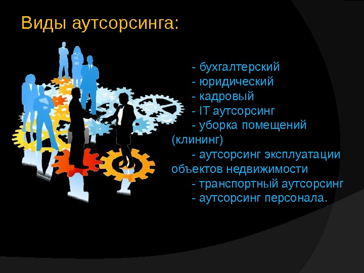 Виды аутсорсинга: — бухгалтерский — юридический — кадровый — IT аутсорсинг — уборка помещений (клининг) — аутсорсинг эксплуатации объектов недвижимости — транспортный аутсорсинг — аутсорсинг персонала.