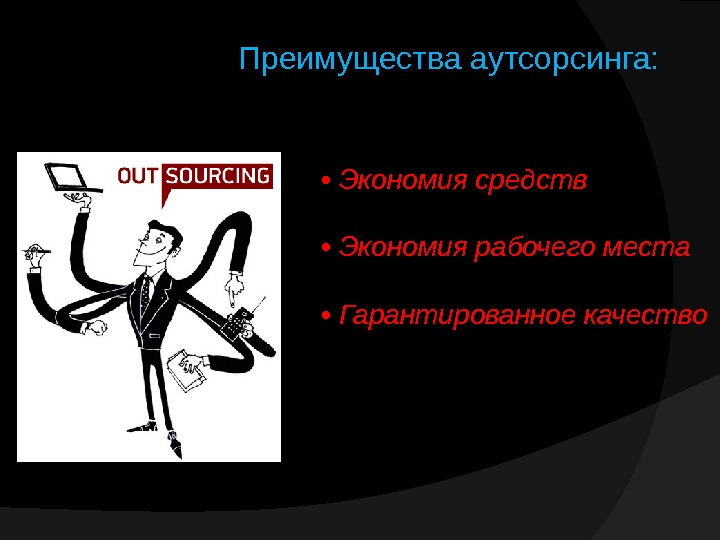 Преимущества аутсорсинга: • Экономия средств • Экономия рабочего места • Гарантированное качество