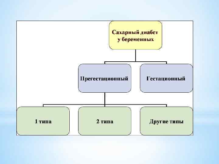 * Согласно рекомендациям ВОЗ, различают следующие типы сахарного диабета у беременных: * Сахарный диабет 1 типа, выявленный до беременности. * Сахарный диабет 2 типа, выявленный до беременности. * Сахарный диабет беременных — под этим термином объединяют любые нарушения толерантности к глюкозе, возникшие во время беременности *