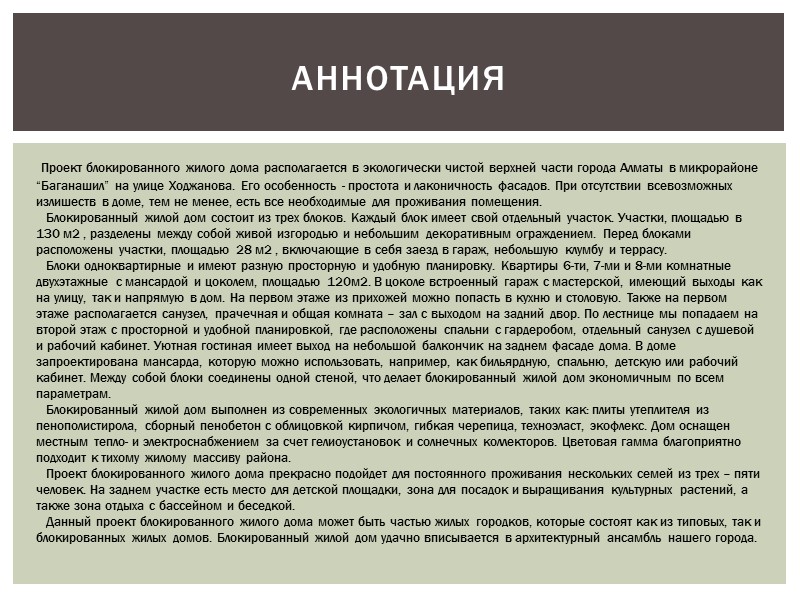 аннотация Проект блокированного жилого дома располагается в экологически чистой верхней части города Алматы в микрорайоне “Баганашил” на улице Ходжанова. Его особенность - простота и лаконичность фасадов. При отсутствии всевозможных излишеств в доме, тем не менее, есть все необходимые для проживания помещения. Блокированный жилой дом состоит из трех блоков. Каждый блок имеет свой отдельный участок. Участки, площадью в 130 м2 , разделены между собой живой изгородью и небольшим декоративным ограждением. Перед блоками расположены участки, площадью 28 м2 , включающие в себя заезд в гараж, небольшую клумбу и террасу. Блоки одноквартирные и имеют разную просторную и удобную планировку. Квартиры 6-ти, 7-ми и 8-ми комнатные двухэтажные с мансардой и цоколем, площадью 120м2. В цоколе встроенный гараж с мастерской, имеющий выходы как на улицу, так и напрямую в дом. На первом этаже из прихожей можно попасть в кухню и столовую. Также на первом этаже располагается санузел, прачечная и общая комната – зал с выходом на задний двор. По лестнице мы попадаем на второй этаж с просторной и удобной планировкой, где расположены спальни с гардеробом, отдельный санузел с душевой и рабочий кабинет. Уютная гостиная имеет выход на небольшой балкончик на заднем фасаде дома. В доме запроектирована мансарда, которую можно использовать, например, как бильярдную, спальню, детскую или рабочий кабинет. Между собой блоки соединены одной стеной, что делает блокированный жилой дом экономичным по всем параметрам. Блокированный жилой дом выполнен из современных экологичных материалов, таких как: плиты утеплителя из пенополистирола, сборный пенобетон с облицовкой кирпичом, гибкая черепица, техноэласт, экофлекс. Дом оснащен местным тепло- и электроснабжением за счет гелиоустановок и солнечных коллекторов. Цветовая гамма благоприятно подходит к тихому жилому массиву района. Проект блокированного жилого дома прекрасно подойдет для постоянного проживания нескольких семей из трех – пяти человек. На заднем участке есть место для детской площадки, зона для посадок и выращивания культурных растений, а также зона отдыха с бассейном и беседкой. Данный проект блокированного жилого дома может быть частью жилых городков, которые состоят как из типовых, так и блокированных жилых домов. Блокированный жилой дом удачно вписывается в архитектурный ансамбль нашего города.