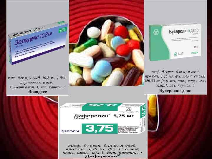 В лечении миомы матки применяются следующие гормональные препараты: Агонисты гонадотропных релизинг-гормонов: ü Гозерелин (Золадекс), ü Бусерелин, ü Трипторелин § Способствуют уменьшению размеров ММ на 55%. § Предупреждают развитие маточных кровотечений. § Снижают болевые ощущения. Препараты этой группы способствуют снижению уровня половых гормонов в крови и создают состояние, схожее с менопаузой. После окончания приема препарата менструальный цикл вновь восстанавливается Длительную терапию агонистами гонадолиберина не рекомендуют назначать молодым женщинам из-за возможности развития остеопороза.