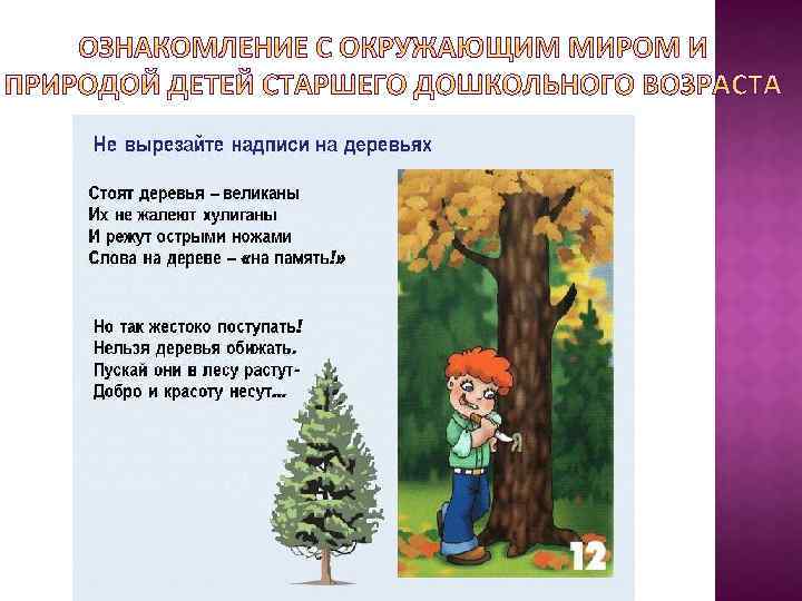 НА ЗАНЯТИЯХ ВСЕХ ТИПОВ НЕОБХОДИМО ЗНАКОМИТЬ ДЕТЕЙ СО СЛЕДУЮЩИМИ ПРАВИЛАМИ ПОВЕДЕНИЯ В ПРИРОДЕ: – Не повреждай кору деревьев – это вредит им: через ранку вытекает сок, могут проникнуть под кору микробы, вызвать заболевание дерева. – Не ломай ветки деревьев и кустарников – растение живое существо, листья участвуют в дыхании растений. – Не рви в лесу, на лугу цветов, запомни – букеты можно составлять из тех цветов, которые выращены человеком.