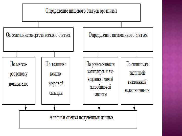 ПОКАЗАТЕЛИ ПИЩЕВОГО СТАТУСА Измерение массы тела и роста Определение массо-ростового показателя Измерение толщины подкожно-жировой клетчатки Определение резистентности кожных капилляров
