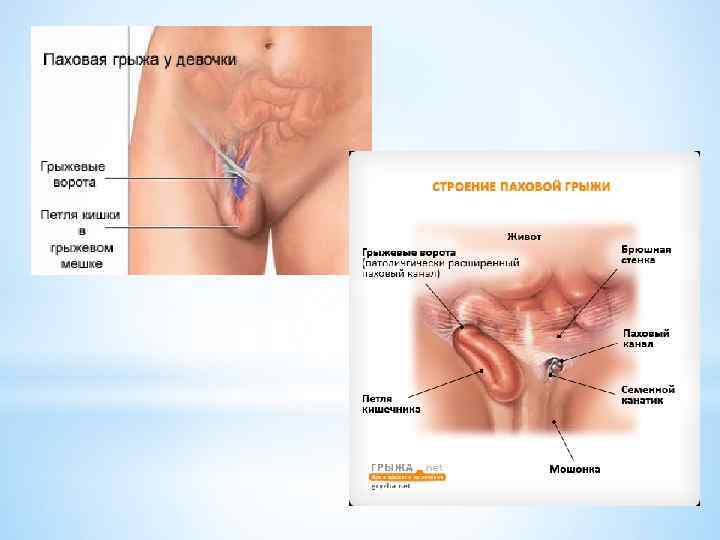 *Паховой грыжей называют выход содержимого брюшной полости через паховый канал. Чаще всего содержимым грыжевого мешка является петли кишечника, а у девочек яичник и маточная труба.