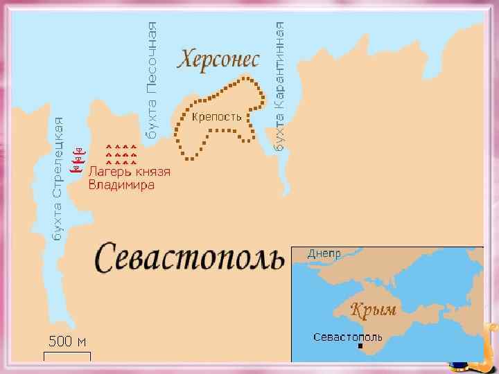 • Пошёл Владимир с войском на Корсунь, город греческий, и затворились корсуняне в городе. И стал Владимир на той стороне города у пристани, в расстоянии полета стрелы от города, и сражались крепко из города. Владимир же осадил город. Люди в городе стали изнемогать, и сказал Владимир горожанам: „Если не сдадитесь, то простою и три года“. Они же не послушались его, Владимир же, изготовив войско свое, приказал присыпать насыпь к городским стенам. И когда насыпали, они, корсунцы, подкопав стену городскую, выкрадывали подсыпанную землю, и носили её себе в город, и ссыпали посреди города. Воины же присыпали еще больше, и Владимир стоял. И вот некий муж корсунянин, именем Анастас , пустил стрелу, написав на ней: „Перекопай и перейми воду, идет она по трубам из колодцев, которые за тобою с востока“. Владимир же, услышав об этом, посмотрел на небо и сказал: „Если сбудется это, — сам крещусь!“. И тотчас же повелел копать наперерез трубам и перенял воду. Люди изнемогли от жажды и сдались. »