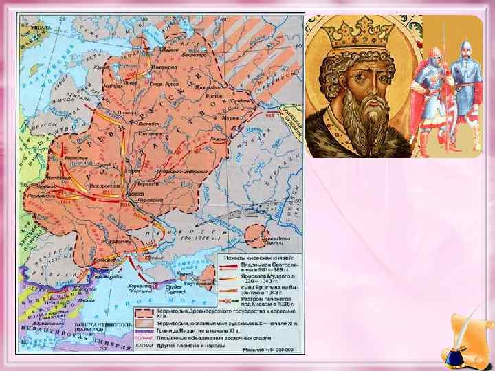 Внутренняя политика Владимира. Задачи: объединение разноплеменного населения Древнерусского государства. • 982 -983 -подавлен мятеж вятичей. Отказавшихся платить дань Киеву. • 980 -987 -попытка приспособить язычество для общегосударственных целей. • 988 – крещение Руси. • 1010 -реформа управления: назначил сыновей наместниками в крупные города Руси. Русская земля превратилась во владение Рюриковичей.