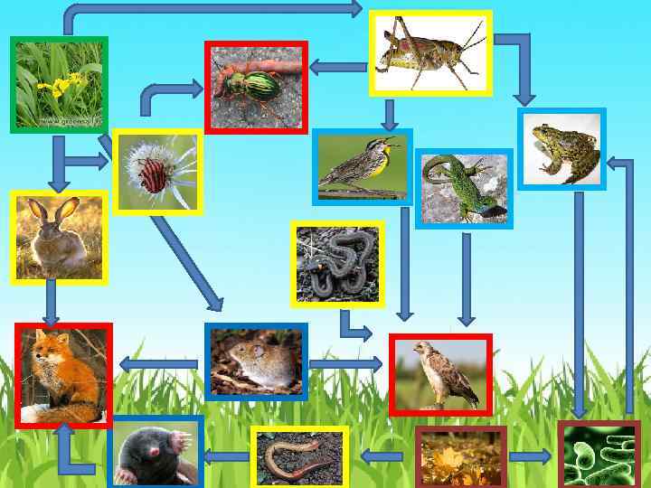 Пищевые цепи луга Пастбищные Растения стрекоза Клевер полевой Растения клоп кузнечик ящерица хищная птица полевая мышь ящерица ласка хищная птица