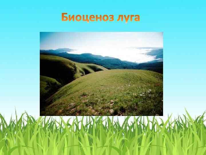 • Луг – это растительное сообщество многолетних травянистых растений-мезофитов, образующих более или менее сомкнутый травостой. • Сообщество луговых растений на определенной территории (биотопе) в совокупности с микроорганизмами, грибами и животными, взаимосвязанных между собой пространственными и трофическими связями образуют экологическую систему – луговой биогеоценоз • Видовой состав луговых растений и животных зависит от рельефа местности, увлажненности, свойств почвы, а также хозяйственной деятельности человека. Луга чаще всего возникают на месте других сообществ (вырубленного леса, осушенного болота и т. д. ), реже они являются сообществами, возникшими естественным путем.