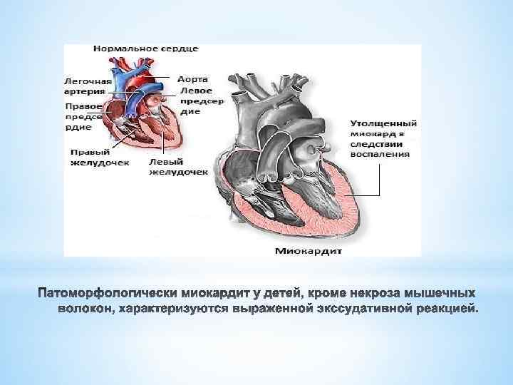 *Миокардит необходимо дифференцировать с заболеваниями, при которых наблюдается кардиомегалия и сердечная недостаточность — врожденный фиброэластоз и пороки сердца, порок левой коронарной артерии с отхождением ее из легочной артерии, синдром Айерса, перикардит, нодозный периартериит с поражением коронарных сосудов, гликогенная болезнь сердца, гиповитаминоз В 1; гипокалиемия