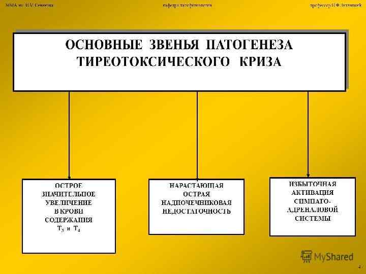 * *Ти реотокси ческий криз — наиболее тяжёлое, угрожающее жизни пациента осложнение диффузного токсического зоба. Опасное осложнение не леченного или неправильно леченного тяжёлого тиреотоксикоза, проявляющееся лавинообразным нарастанием проявлений, вызванное резким повышением уровня T 3 и T 4 в плазме крови. Развивается у пациентов с тяжёлой формой заболевания в 0, 5— 19% случаев.