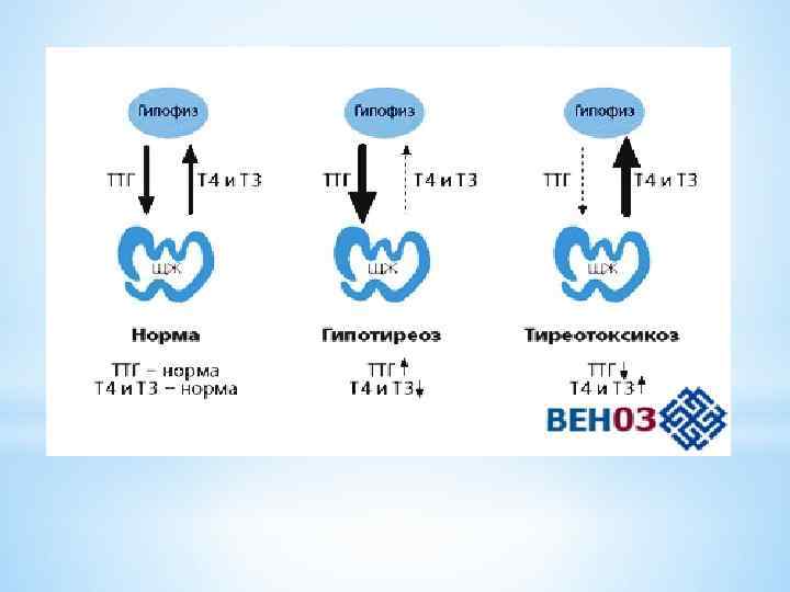 *Для ПТ характерны транзиторный тиреотоксикоз и транзиторный гипотиреоз, при этом возможно как двухфазное, так и однофазное течение. При типичной двухфазной форме развивается транзиторный тиреотоксикоз, за которым следует восстановление функции ЩЖ, а затем гипотиреоидная фаза (30 % всех случаев). Тиреотоксическая фаза характеризуется развитием транзиторного тиреотоксикоза примерно через 8– 12 недель после родов, продолжается 1– 2 месяца и обусловлена высвобождением в кровь готовых тиреоидных гормонов, запасенных в ЩЖ. *Последующая гипотиреоидная фаза развивается в среднем на 19 -й неделе после родов, продолжается 4– 6 месяцев, сопровождается гипотиреоидной симптоматикой, которая требует назначения заместительной терапии L-Т 4. Через 6– 8 месяцев функция ЩЖ восстанавливается.